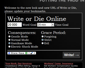 I visited Dr. Wicked’s Write or Die site. There, you set a goal — mine is usually 500 words in 10 minutes, which I’ve yet to achieve. You must keep writing for the committed time, because if you lift your fingers, even for a few seconds, lights will flash, car horns will start honking, and I don’t know what else happens, because I start moving my fingers on the keyboard so that Dr. Wicked will not yell at me ever again. (Fear=motivator.)