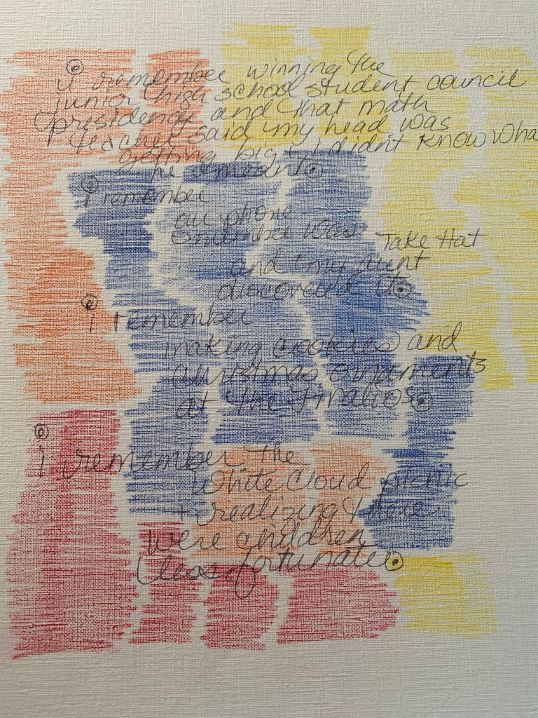 You start your hand moving. And then you just keep it moving. You write, I remember… and you keep writing memories… popping like popcorn. One memory after another. Don’t worry about which era from your life wherein the memory emeges or how you feel or what it all means.