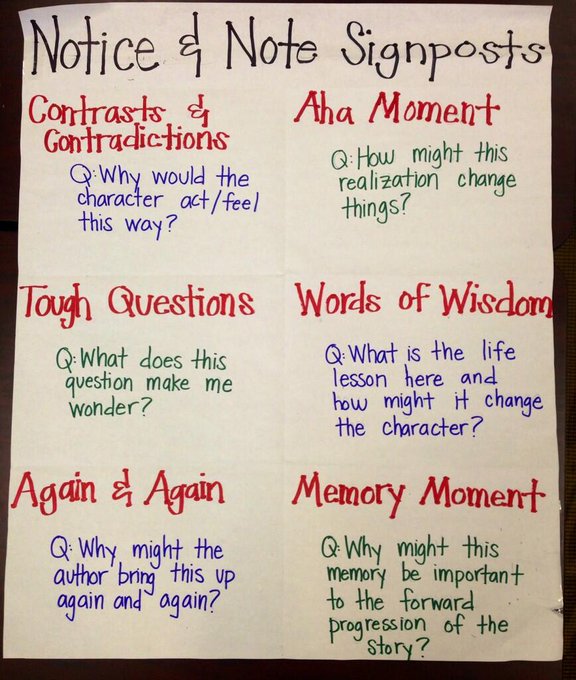 A signpost is usually found at a crossroads. So says the definition. And in the teaching book Notice and Note, you’re given six avenues — ways to go or topics of conversation. What should we notice in a book? How do we note what we read?