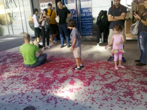 On my bike ride Saturday, I passed this scene in the Meatpacking District. The sidewalk was covered with rose petals. There were enough for everyone.