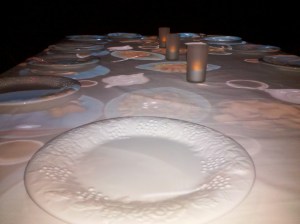 “Really?” I hung back. I was the only one in this little chapel. Should I really sit at the table? It looked nice, well lit, sounds of dishes clattering and conversation. I was a little hungry. The food was spread on the table. I was thinking this must be some kind of Judy Chicago-inspired womanist art piece.