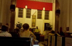 I think it was a Brazilian Church because the Brazilian flag was draped over a pew in the back and a sign outside listed a 7 pm Brazilian church service. I wandered in around 7:50.